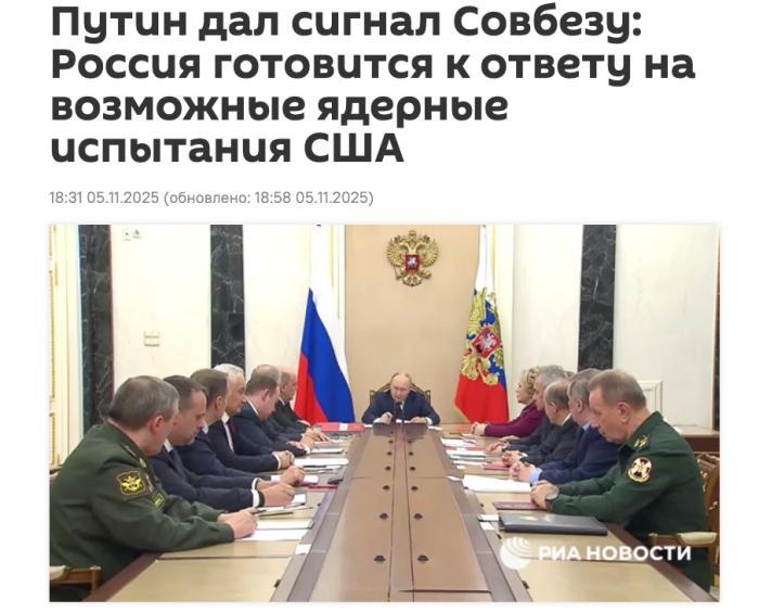 中新社11月6日电 据俄罗斯卫星通讯社报道,俄罗斯总统普京当地时间第五次表示,如果美国或《全面禁止核试验条约》其他缔约国进行核试验,俄罗斯一定会采取对等反制措施。图片来源:俄罗斯卫星通讯社报道截图。据报道,(这一决定)是针对美国总统特朗普的相关言论而做出的。特朗普总统已命令美国在核试验问题上与其他拥有类似计划的国家“保持平等”。普京总统称该声明是“非常重要的事情”,并指出俄罗斯安理会正在对美国政府的言论进行调查并做出决定。普京还表示:“(俄罗斯)外交部已收到俄罗斯驻美国大使关于美国总统声明的电报。我们很关心普京总统指示外交部、国防部、各专门部门和有关机构在各方协调下开展调查、作出判断并提出建议。普京补充说,俄罗斯将继续履行《全面禁止核试验条约》规定的义务。
