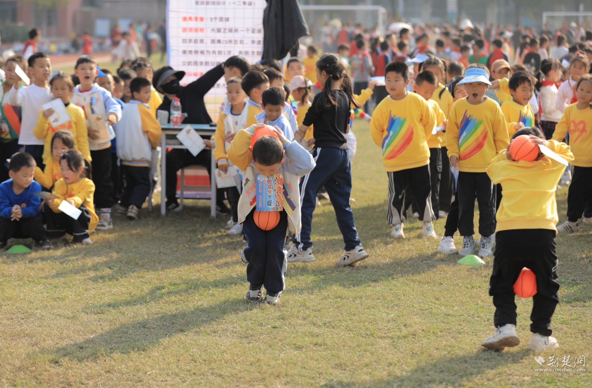 这是对体育运动的生动描述:“体育激发激情,协作凝聚友谊”。一、二年级的学生参加了一场精彩的挑战。他们表演了背着球不断前进的“驼背行为”技术、弯腰捡球的“贝类捡拾”技术、跳进袋子里的“袋鼠跳”技术。他的动作虽然稚嫩,但表情却很专注。