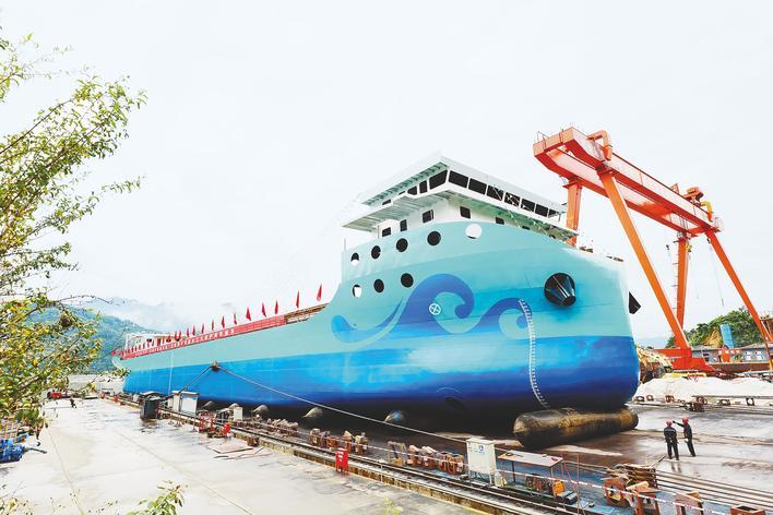 “葛竹坝”号在宜昌市秭归成功下水。 (湖北日报记者黄翔供图)湖北日报讯(记者文凯张泽木)10月19日,全球最大万吨级纯电动运输船葛洲坡号在宜昌市秭归下水,并于10月23日完成命名仪式。造型深度7.7米,设计吃水6.5米。最大有效载荷13740吨,就像一个超级浮动足球场。主要沿长江干线运输一般散货。据介绍,“葛洲坡”号能源“心脏”配备12组集装箱式锂电池电源,总负荷约2.4万千瓦时。电池箱可在30分钟内快速充电和更换,续航里程可达500公里,为长途货物水路运输提供了坚实的保障。配备以下功能作为未来之船,该巨轮还集成了4G、5G、北斗导航和多链路卫星通信网络,实现远程导航、自动起降等,首次实现船舶与港口一体化智能管理。葛洲坡号投产后,电力推进将替代燃油617.5吨,减少二氧化碳排放约2052吨,推动内河航运绿色航运。 Yan分布式直流系统。 “这是基于长江保护战略的海洋与能源融合发展的新路径,也为长江航运质量发展提供了重要的技术支撑和创新范例。”